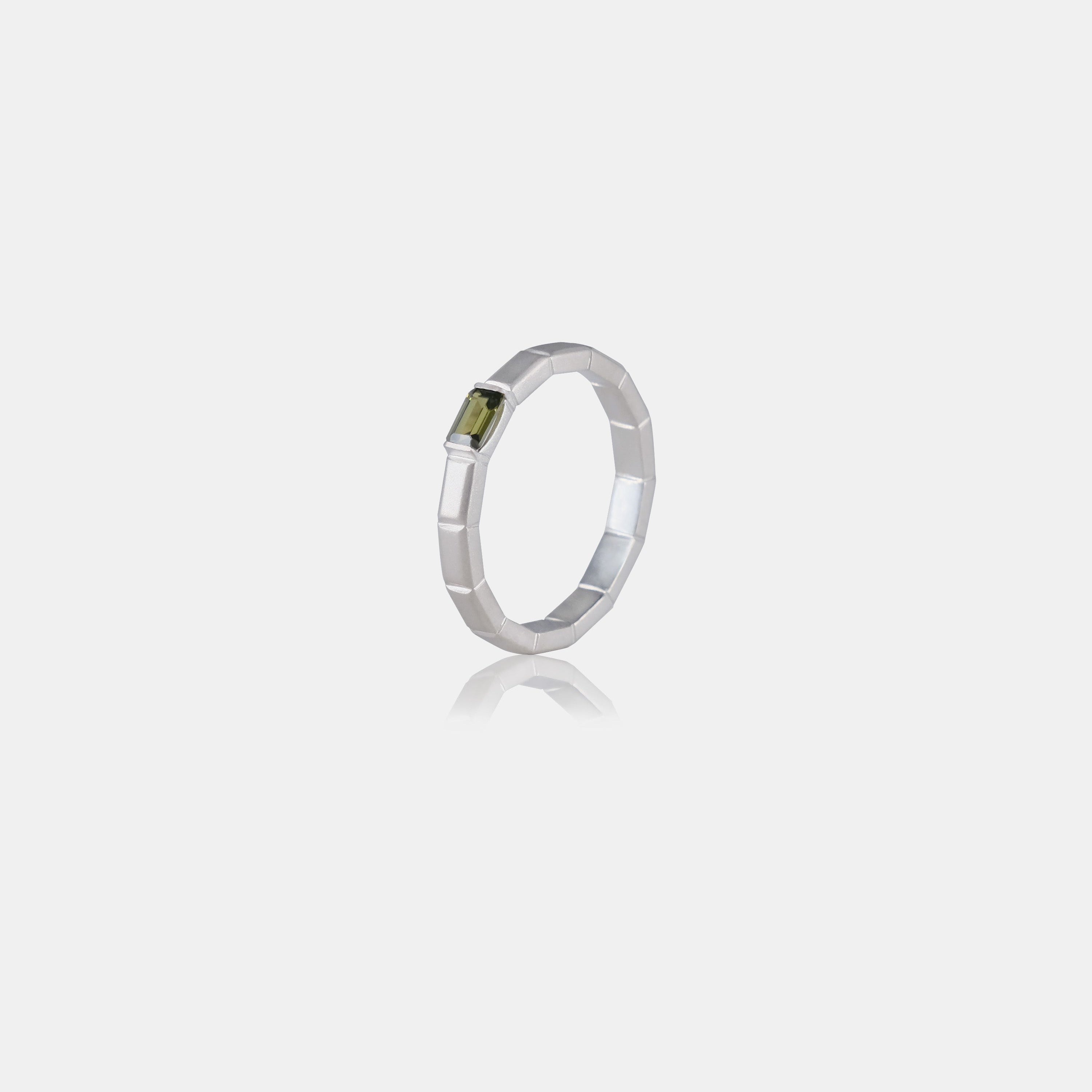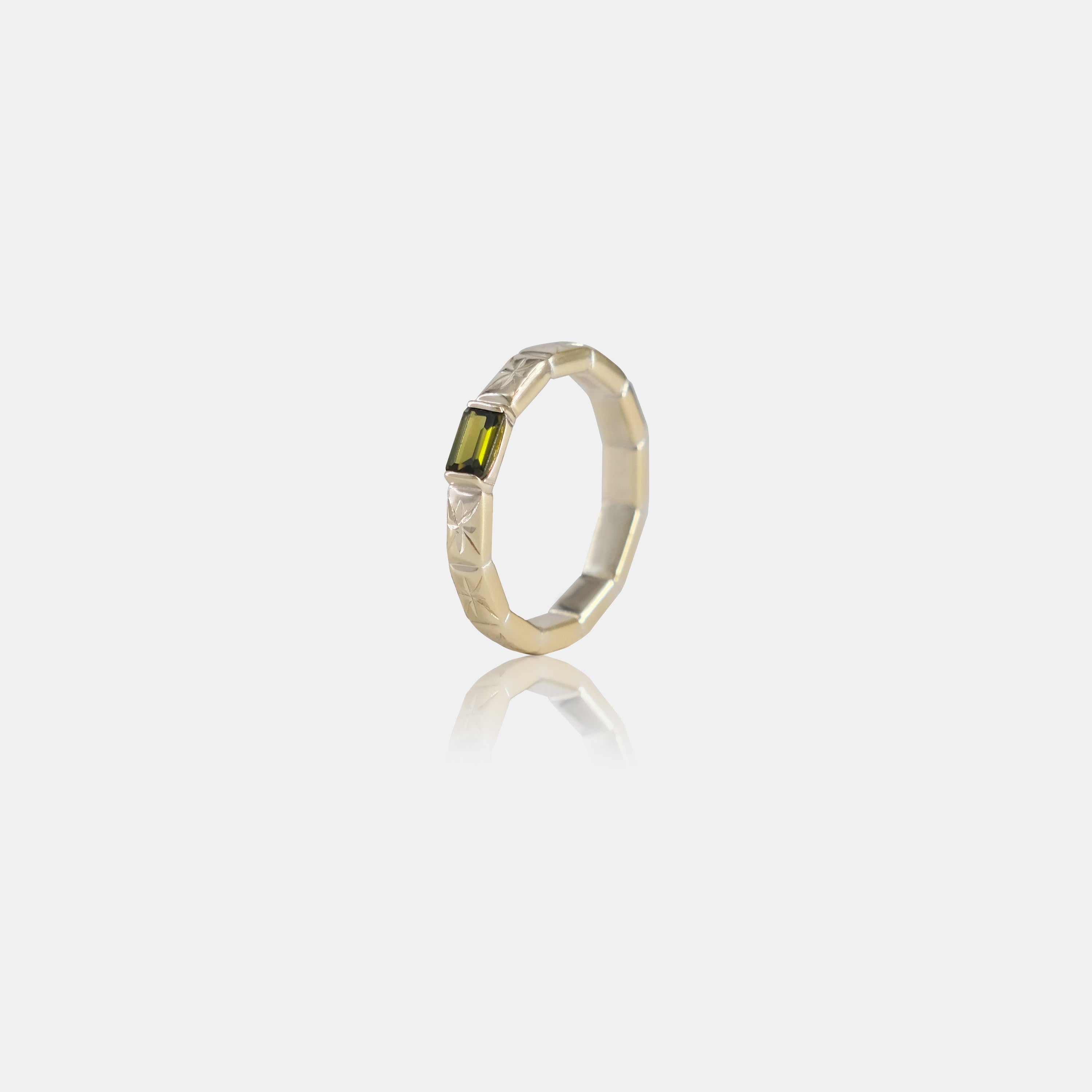 The Meteor collection is inspired by the geometry of constellations, evoking a sense of mystery and illusion. Crafted by hand in recycled 925 silver and 14k yellow gold plating, it is set with a vibrant peridot that signifies strength and confidence—qualities vital for enduring love. Its celestial design makes it an alluring accessory that captures the enigmatic beauty of the universe while embodying personal symbolism.